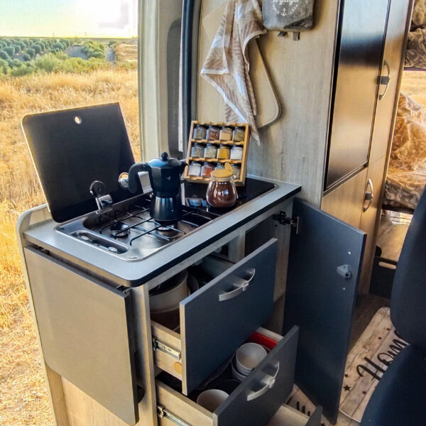 - Cocina y fregadero, marca CAN con 2 fuegos con piezoeléctrico.